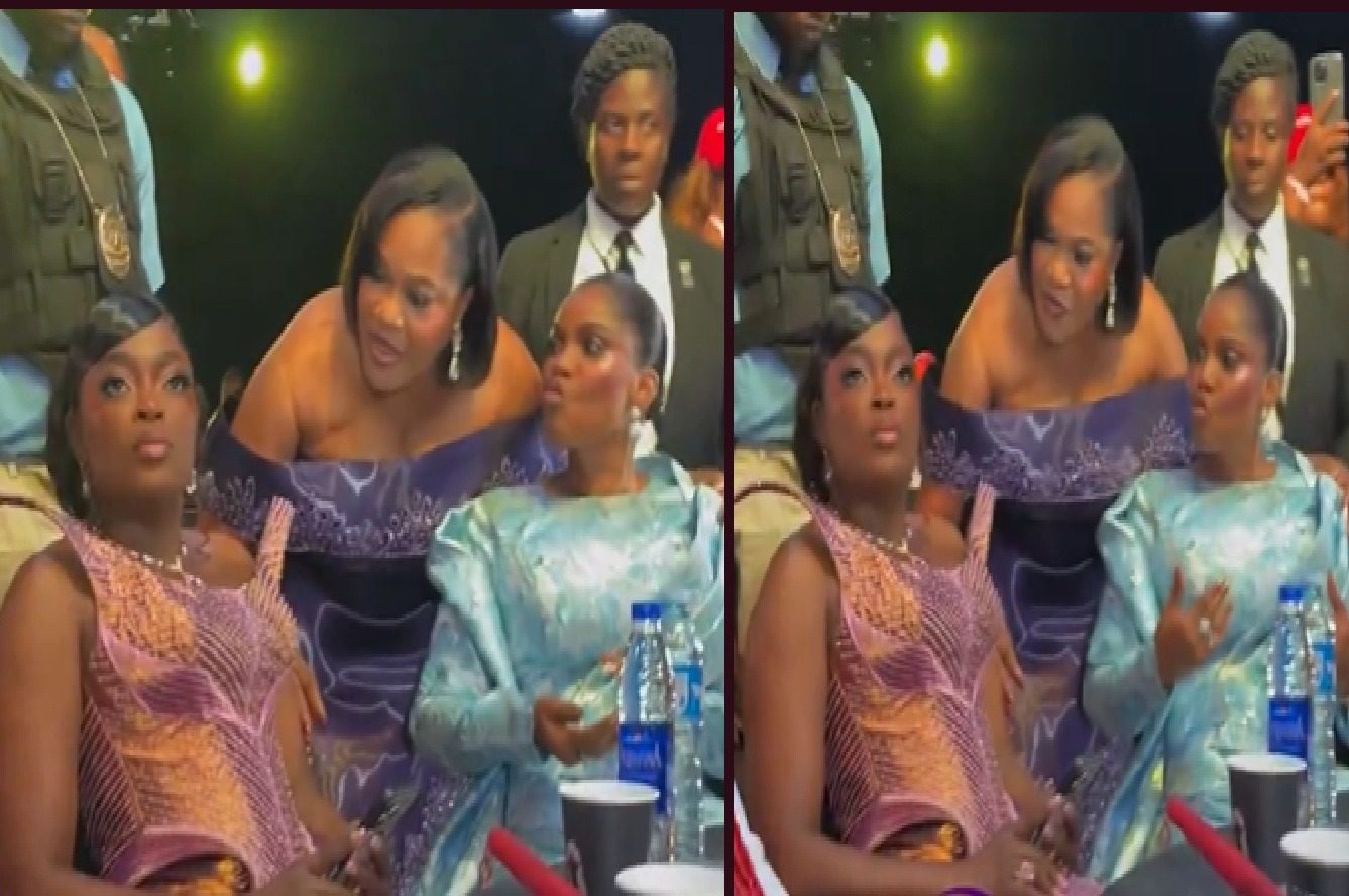 Nollywood actress Funke Akindele has sparked reactions online after seemingly ignoring colleague Toyin Abraham at the premiere of Iyabo Ojo’s latest movie, The Return of Arinzo. In a clip that quickly went viral, Funke was seated alongside Iyabo Ojo and Mercy Aigbe when Toyin approached to greet her, only to be left hanging, leaving many viewers shocked and Toyin momentarily embarrassed.